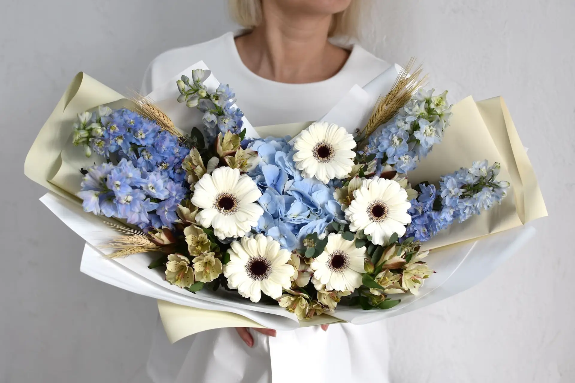 Элегантный букет в небесно‑голубой и молочной палитре. Пышная гортензия создаёт объём, белые герберы добавляют графичности, а дельфиниум и нежные акценты придают композиции воздушность. Стильный вариант для юбилея, свадьбы, благодарности или подарка с утончённым настроением.