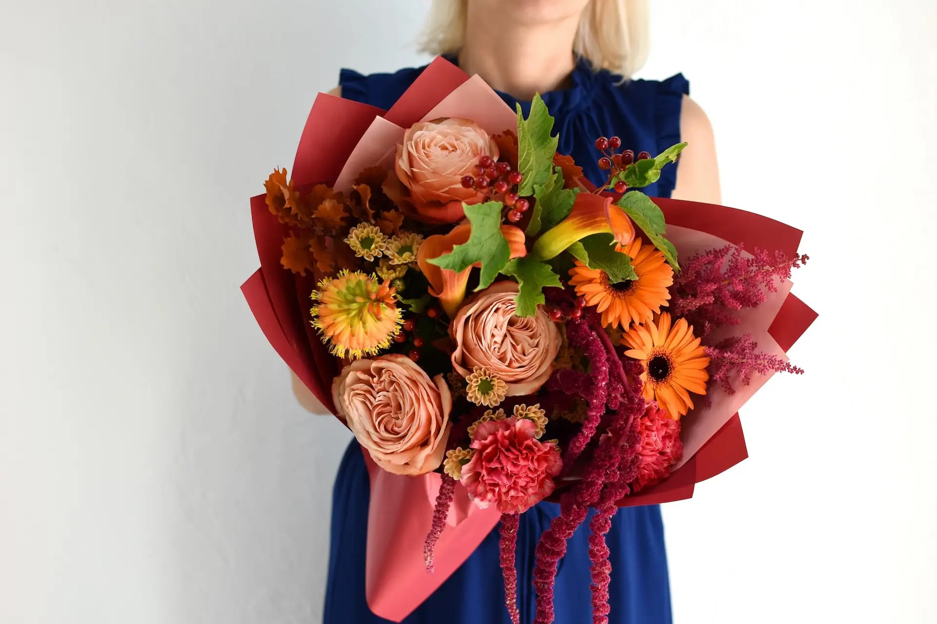 Состав (может незначительно меняться по сезону): пионовидные розы, герберы, гвоздики/сезонные цветы, амарант/фактурные элементы, декоративные ягоды, зелень, авторская упаковка.