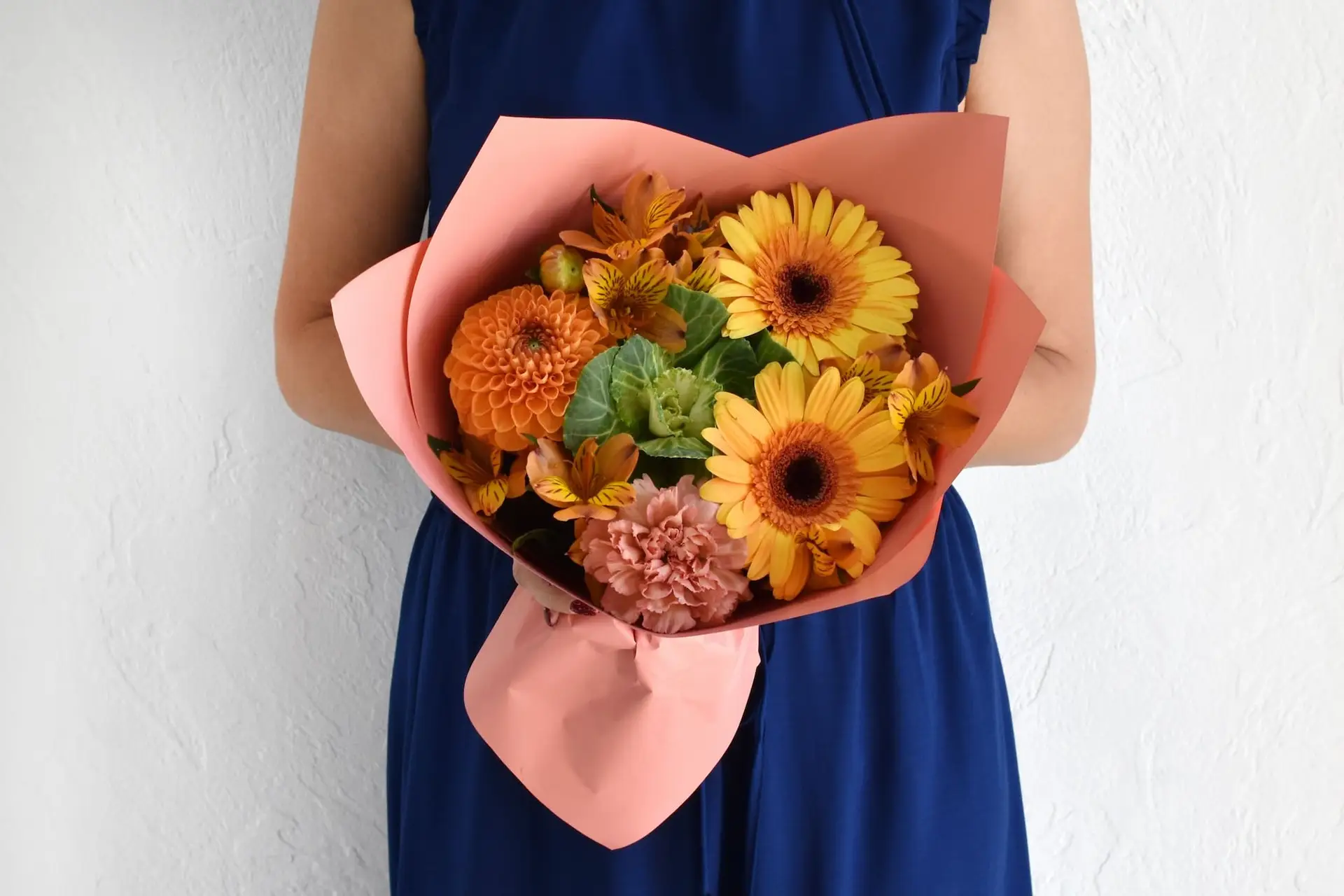 Компактный, яркий букет в тёплой оранжевой гамме. Герберы и георгина создают солнечный акцент, альстромерия добавляет лёгкости, а зелень придаёт композиции свежесть и глубину. Отличный вариант для небольшого, но эффектного комплимента, благодарности или знака внимания без повода.