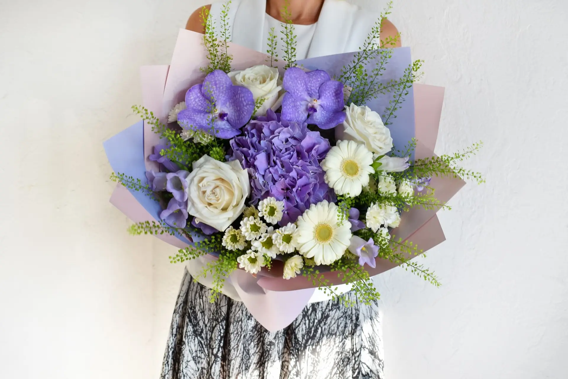 Статусный букет в сиренево‑белой гамме с эффектными акцентами. Пышная гортензия задаёт объём, белые розы добавляют классики, а орхидея придаёт композиции яркий «вау»-штрих. Ромашковые детали и зелень делают букет лёгким и свежим. Подойдёт для дня рождения, юбилея, благодарности и особых случаев.