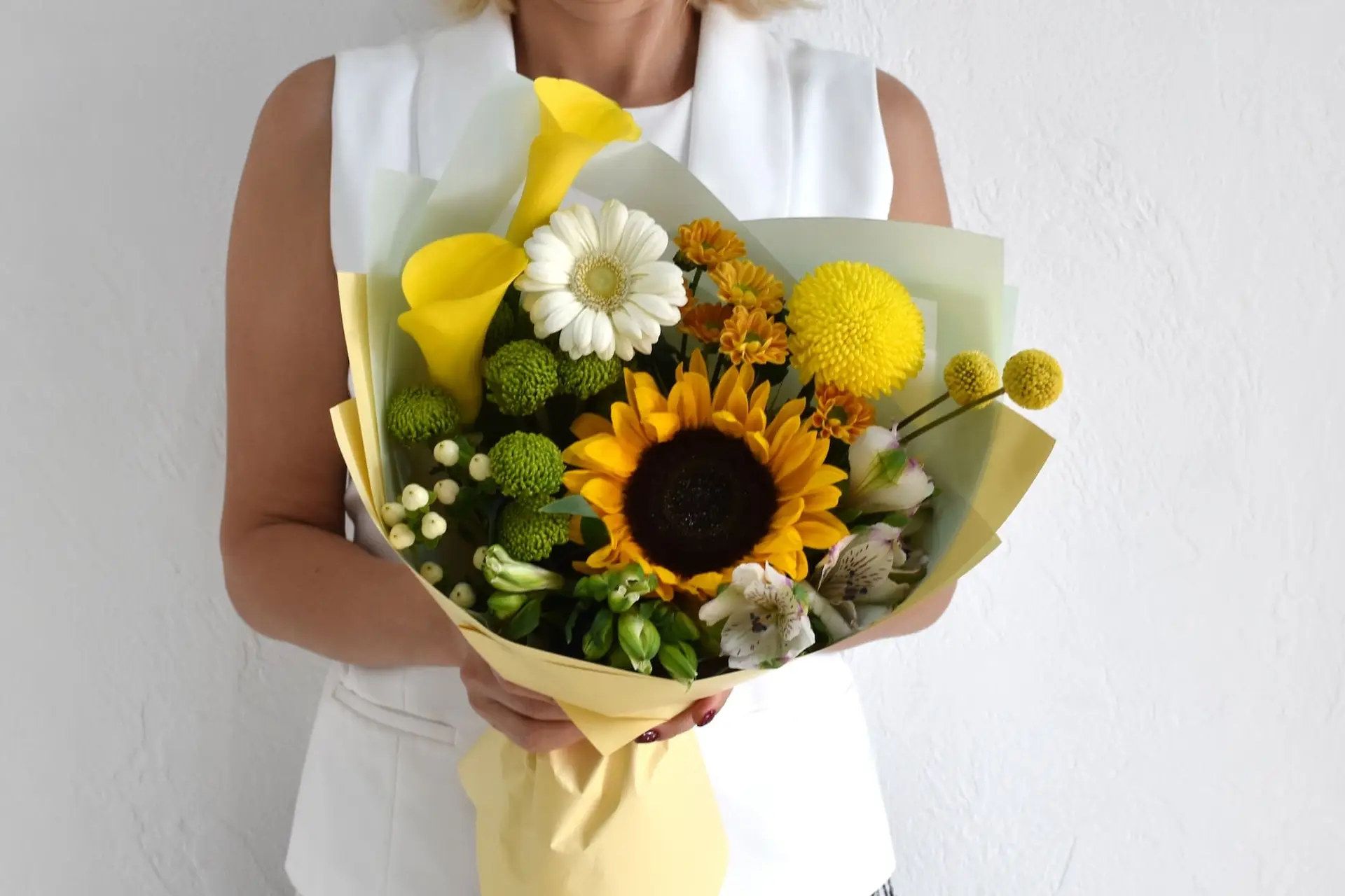 Состав (может незначительно меняться по сезону): подсолнух, каллы, гербера, хризантемы (в т.ч. сантини), альстромерия/сезонные цветы, декоративная зелень, авторская упаковка.