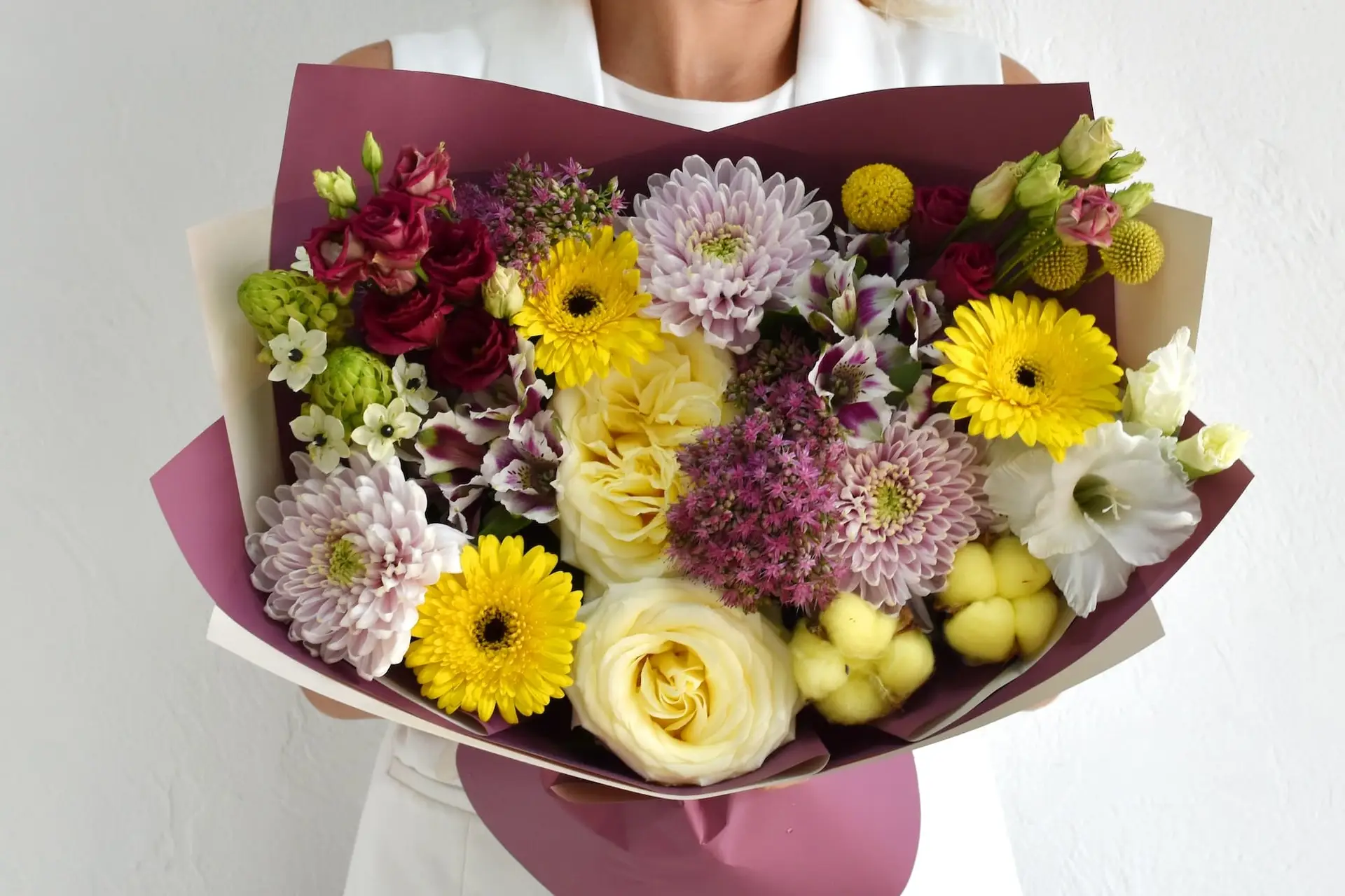 Яркий и уверенный букет с тёплыми акцентами — чтобы поднять настроение с первого взгляда. Жёлтые герберы и кремовые розы дают ощущение света, а бордово‑розовые детали добавляют глубину и контраст. Отлично подходит для поздравления, благодарности, корпоративного подарка или «просто порадовать».