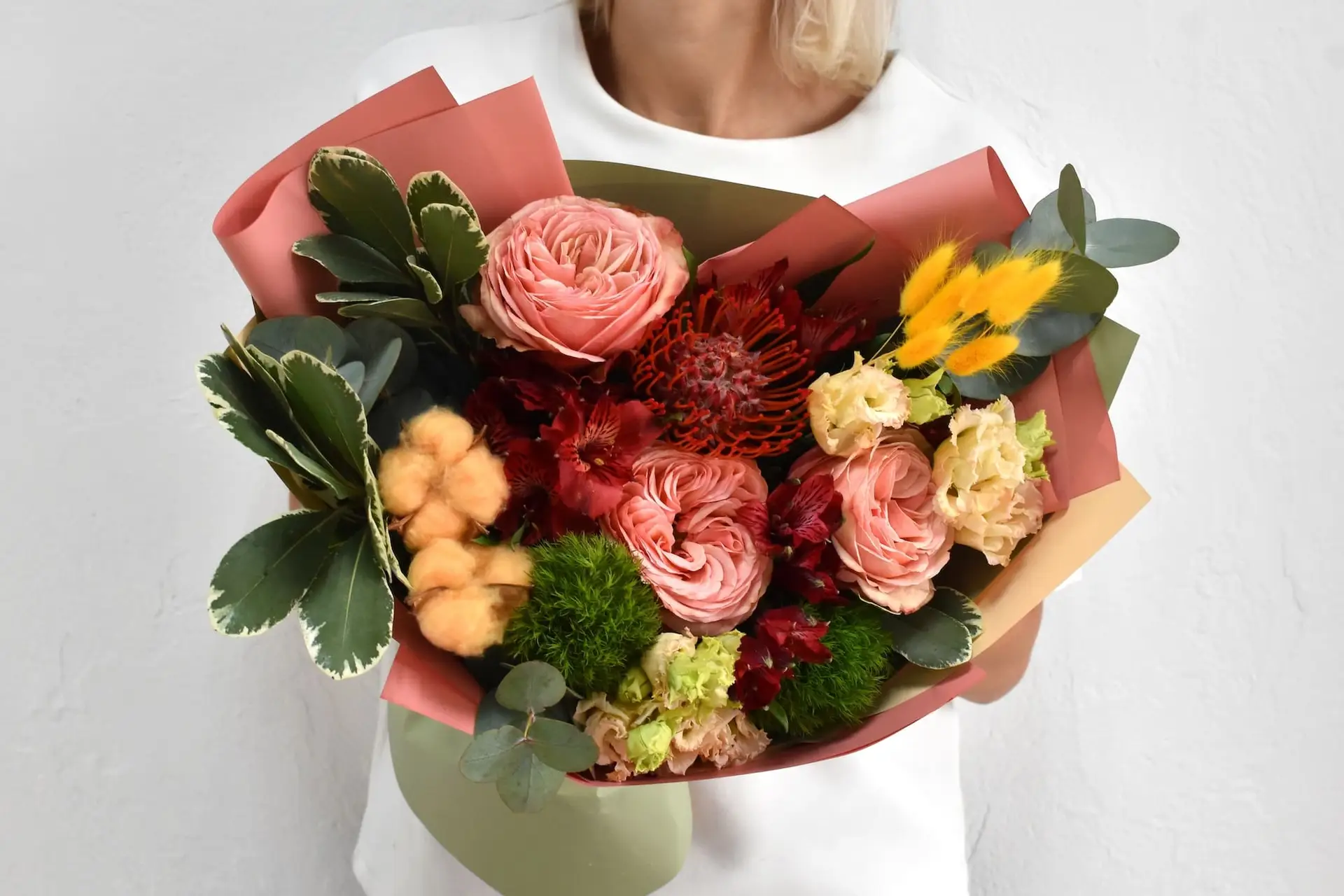 Тёплый авторский букет в персиково‑бордовой палитре с природными фактурами. Пионовидные розы создают выразительный центр, экзотические акценты и зелень добавляют глубины, а мягкие текстуры делают композицию современной и стильной. Подойдёт для юбилея, благодарности или эффектного комплимента.