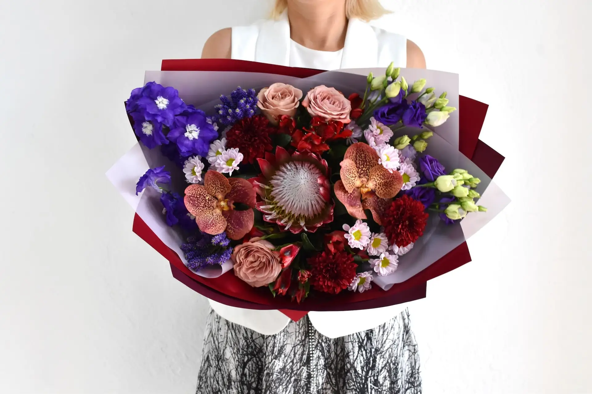 Состав (может незначительно меняться по сезону): протея, орхидеи, розы, хризантемы, эустома/сезонные цветы, декоративная зелень, авторская упаковка.